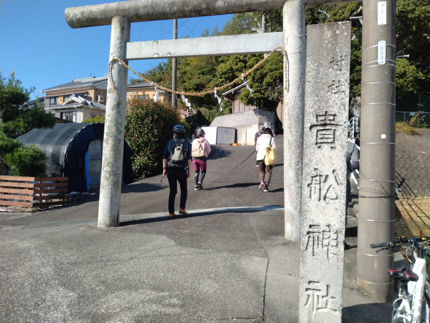 最終の佐浜町の「貴船神社」へ庄内湖を左に見ながら到着。貴船神社と古代の庄内湖の湖岸の位置関係を確認しながら、お社が湖に向いていることや、今日訪ねた摂社が、神様が海路でお渡りすることを想定していることを感じることができました。
